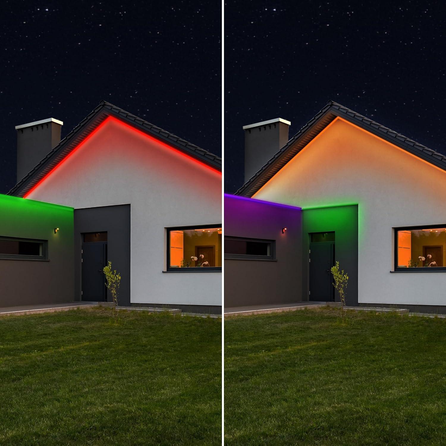 Add a splash of color to your space inside or out with the Feit Electric Color Changing LED Strip Light. Measuring 32 feet across, this flexible strip with embedded LEDs bends up to 90 degrees to fit any size and angle. Create a colorful backlight behind the television, under cabinets, or inside bookcases. Turn a drab room into a gaming paradise or set the mood for holidays and special events. To fit smaller spaces, cut the strip along the guiding lines. Set a white color temperature or choose from 16 preset colors. Adjust the brightness and choose effects like flash, pulse, fade, and color cycling with the included remote control. No apps or Wi-Fi needed. This versatile light is damp-rated for safe use in bathrooms, kitchens, or covered outdoor areas. Take it outside for ambient lighting on patios, around decking, or under windows. Live your life in full color with TAPE384/RGB Color Chasing strip lights.