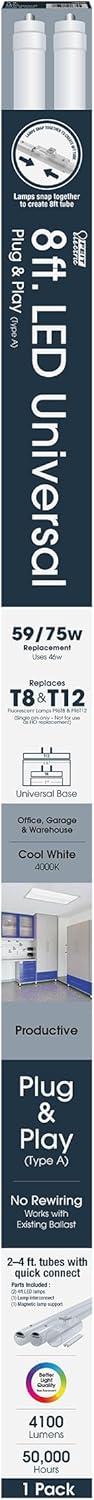 PLUG AND PLAY INSTALLATION – BALLAST COMPATIBLE DESIGN – No rewiring or complex modifications needed! This 8ft T8/T12 replacement tube is ballast compatible, designed for easy “plug and play” installation with most existing ballasts—eliminating the need for professional assistance. Simply replace your existing fluorescent tube, and you're good to go. Hassle-free lighting upgrade made simple for everyone.