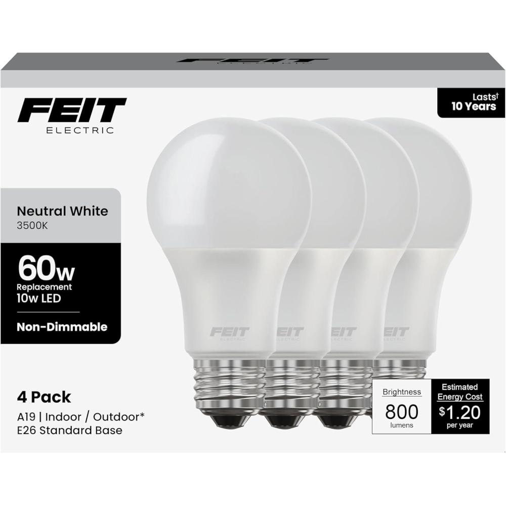 Feit Electric A19 LED Light Bulb, 60W Equivalent, E26 Medium Base, 800 Lumens, 3500K Neutral White, Non-Dimmable Standard Light Bulb, 10-year Lifetime, A800/835/10KLED/4, 4 Packs