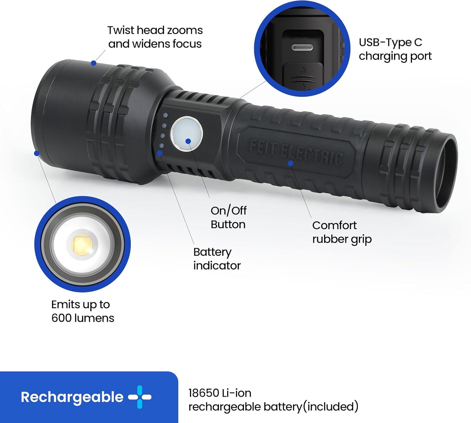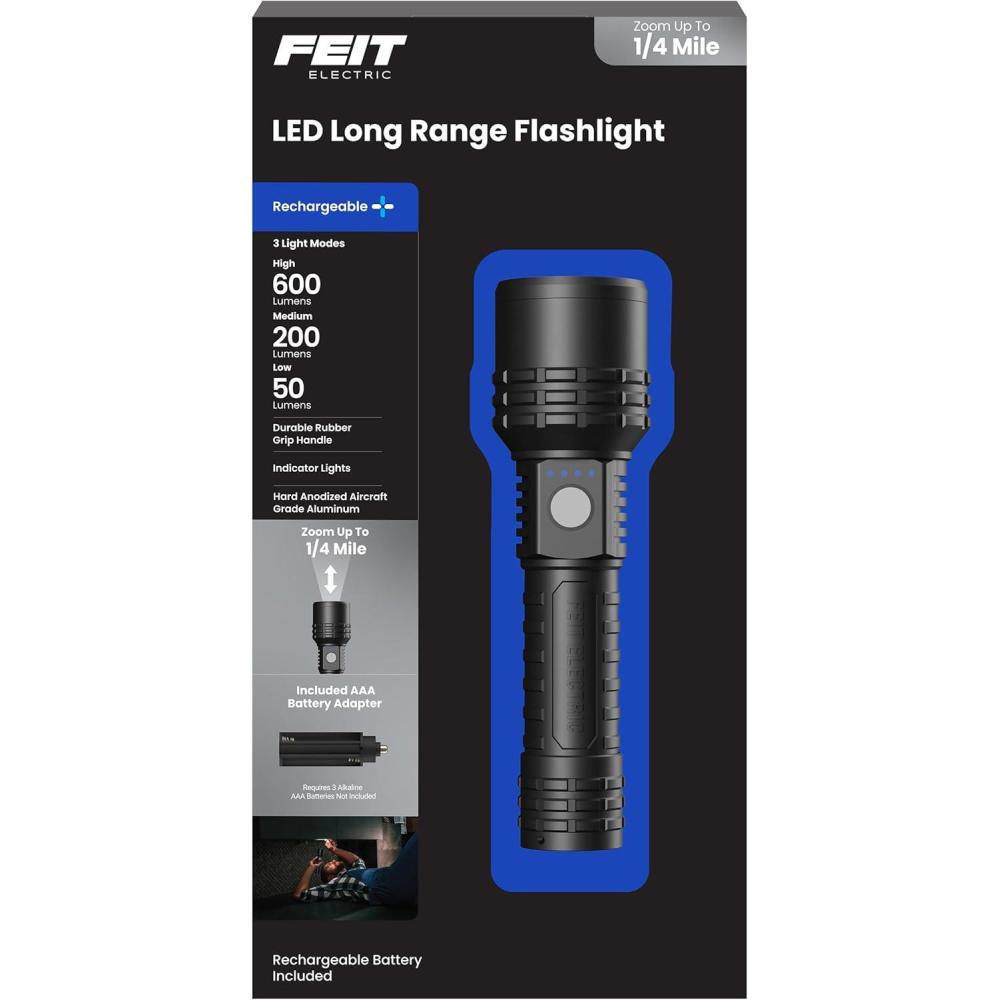 Vanquish the darkness and be prepared for anything with the Feit Electric FLR7000/FLEX Flex Power Flashlight. This powerful flashlight is constructed from durable aircraft-grade aluminum and is treated with a special coating to prevent rust and corrosion. It comes with a rechargeable battery with charging indicator and a USB-C charging cable. It can also be powered by (6) AA batteries if plug-in charging is unavailable (AA batteries sold separately). This handheld flashlight emits a powerful 7000 lumens of ultra-bright light with a twisting head that allows for wider or more focused light. It includes High, Medium, and Low modes to tailor light strength to any job. The Flex Power flashlight is wet rated for outdoor use in rain and wind. It includes a rotary lock to prevent accidental operation. The perfect addition to any emergency kit, it includes a bezel edge for emergency glass breaking and a built-in USB charging port for powering devices. It also features an added safety mechanism that shuts the light off when objects block the lens. Choose a dependable weather-resistant flashlight for your next project or adventure by choosing Feit Electric.